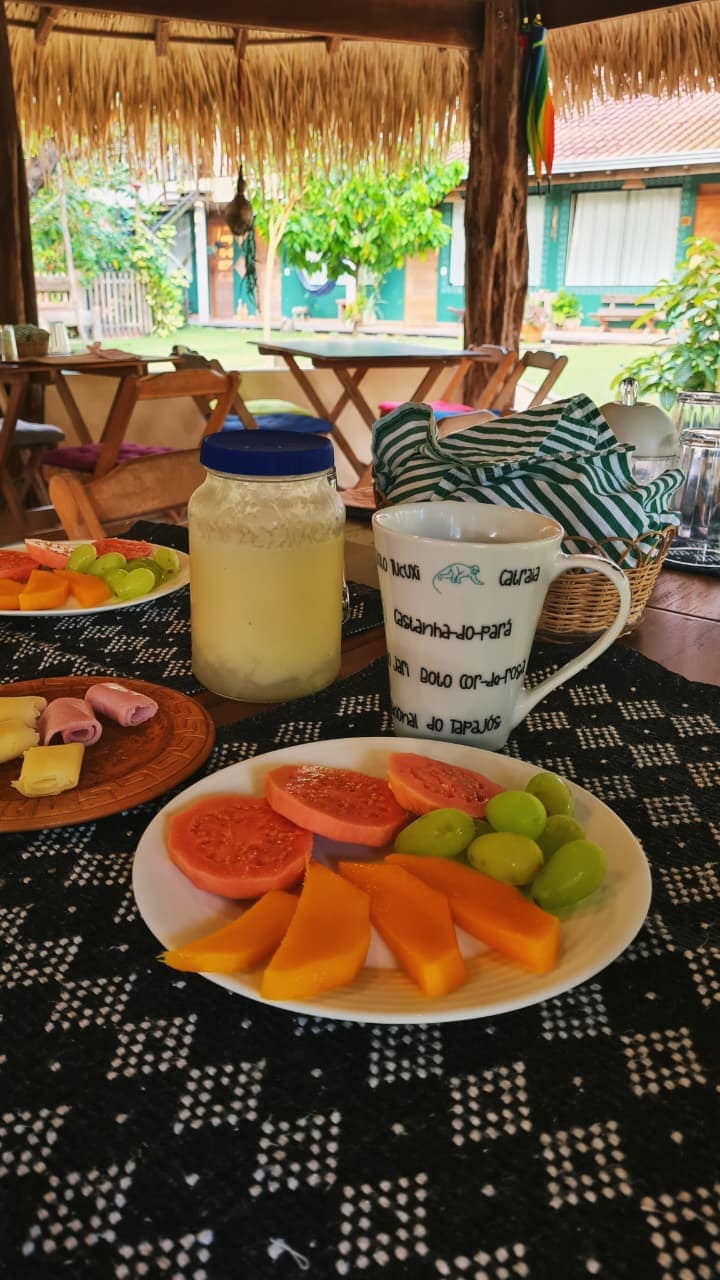 Comece seu dia de maneira deliciosa com um café da manhã incrível em nossa propriedade. Desfrute de uma variedade de pratos frescos, sucos refrescantes de frutas regionais, pães, frutas e muito mais. Saboreie cada mordida enquanto aprecia a atmosfera acolhedora da Casa Saimiri, a melhor pousada em Alter do Chão perto da praia!